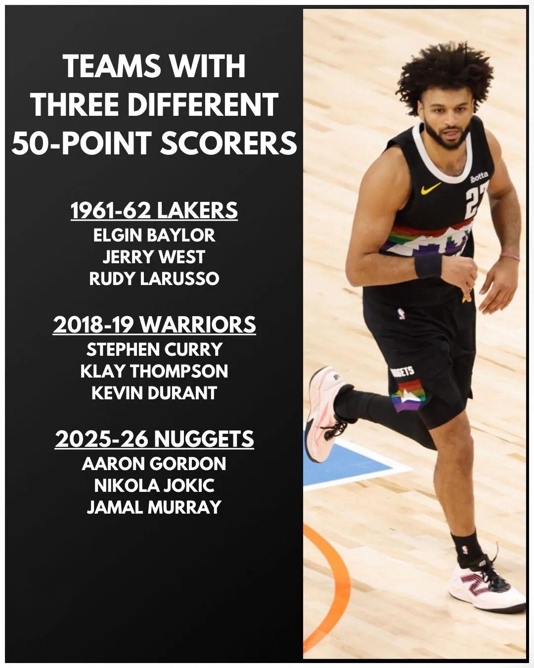 有趣的一个数据是,本赛季掘金已经有三人拿下过50+,此前两次分别是戈登对阵勇士50分、约基奇对阵快船55分,这是NBA历史上第三次单赛季同队3人50+,此前两次分别是:
