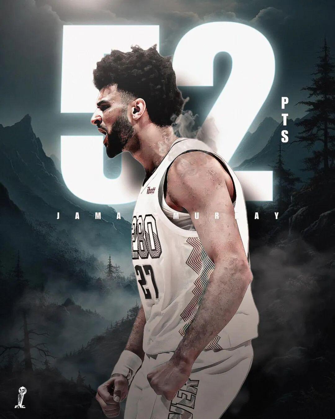 这场比赛,贾马尔穆雷打出了赛季至今最强一战:全场出战36分钟,投篮25中19,三分11中10,罚球5中4,得到52分6篮板4助攻1抢断,他的单场真实命中率达到了95.6%。