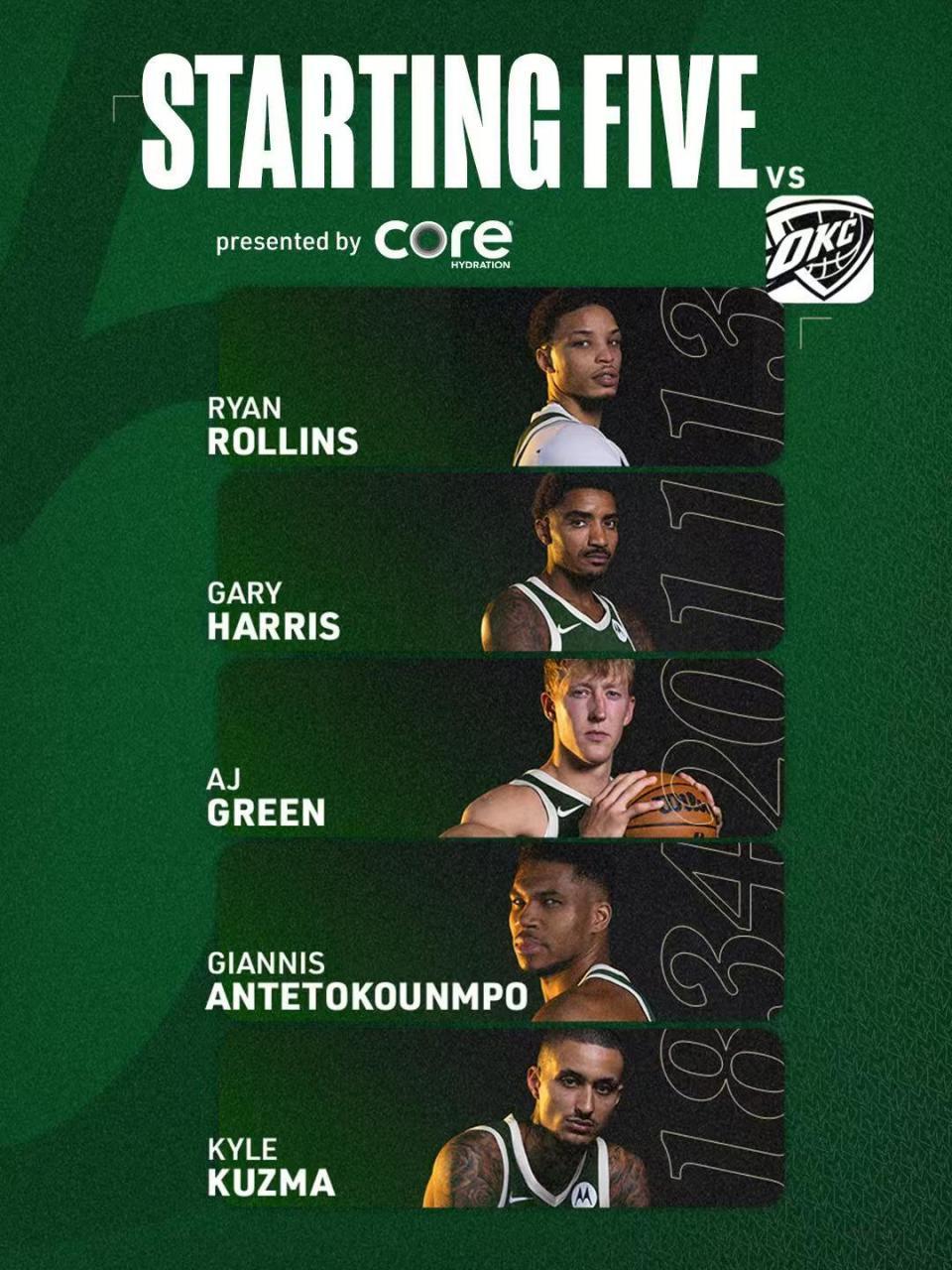 雄鹿:哈里斯、罗林斯、字母哥、库兹马、格林